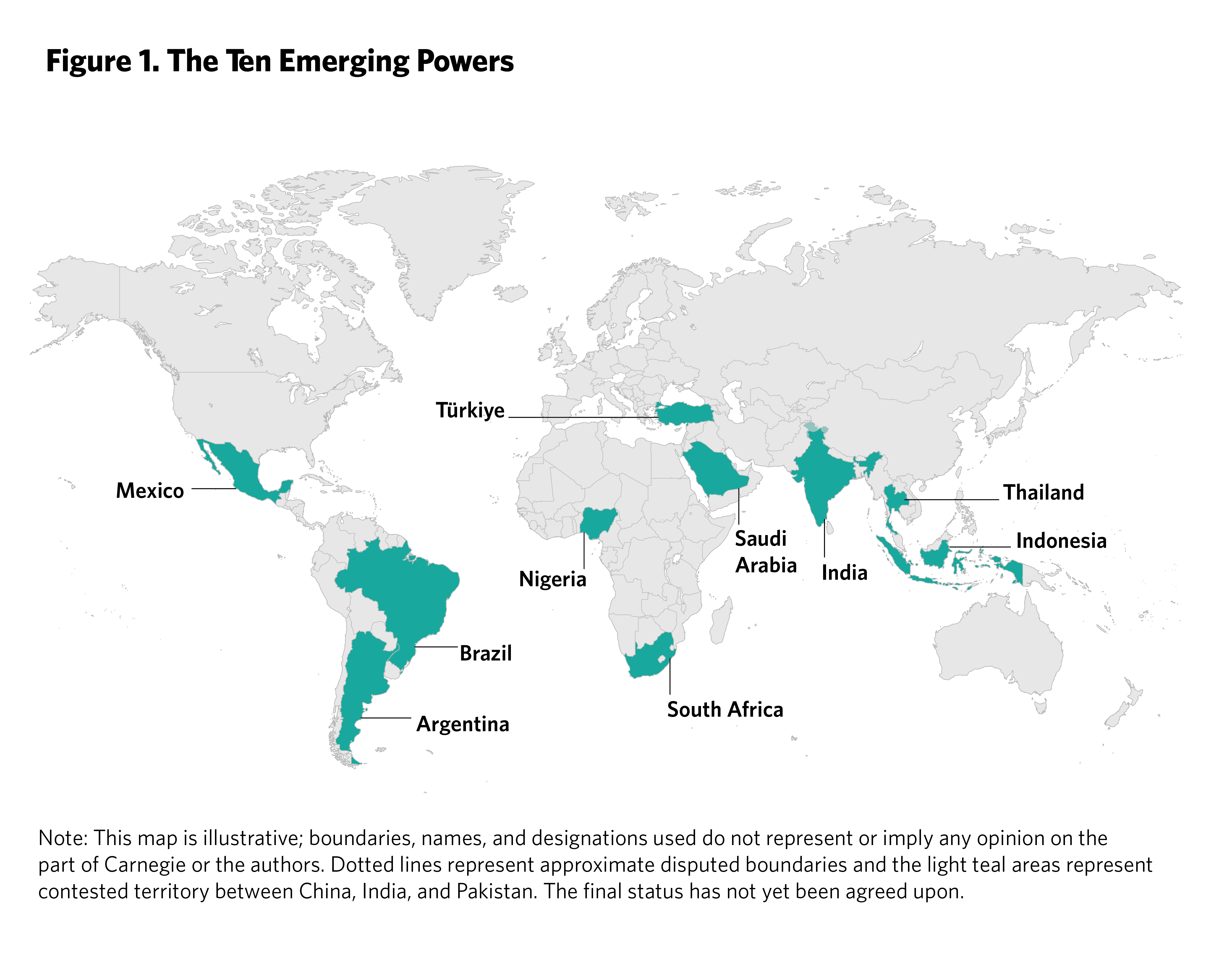 To determine what approach the United States should take toward emerging powers, this report looks at ten of the most important emerging powers in economic and strategic terms. They are part of what is often called the Global South, spanning Africa, Asia, Latin America, and the Middle East. They make up about a third of the world’s population and a fifth of its economic production (see figure 1).1 They include three members of the original BRICS—Brazil, India and South Africa—and five other members of the G20: Argentina, Mexico, Indonesia, Saudi Arabia, and Türkiye (see box 1).2 The other two countries included in this report are Nigeria and Thailand.