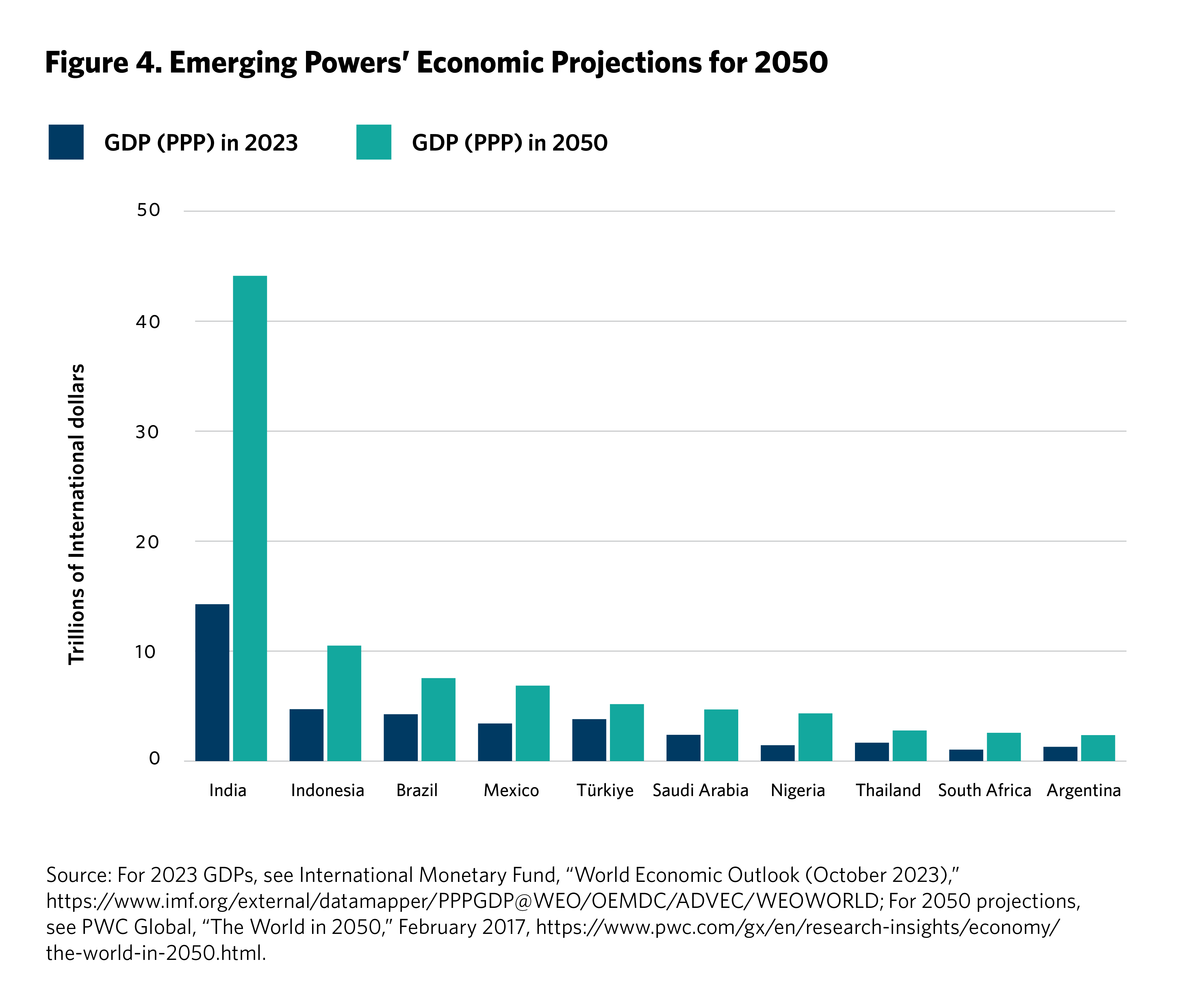4 Measured by purchasing power parity. See PwC Global, “The World in 2050,” February 2017, https://www.pwc.com/gx/en/research-insights/economy/the-world-in-2050.html.