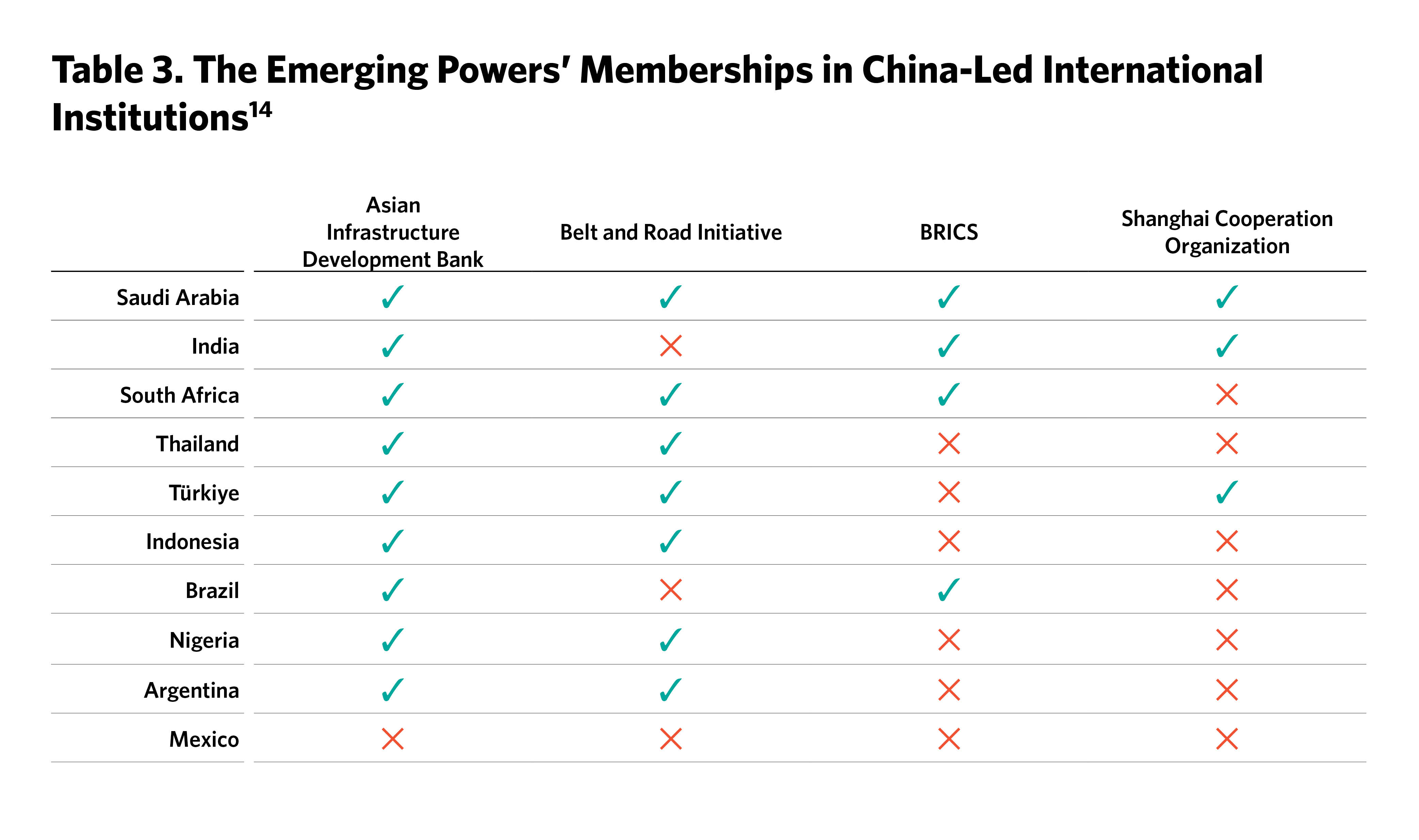 These countries thus are representative of but not constitutive of the Global South. They are among the world’s “middle powers” but do not represent the grouping, which also includes countries such as Germany and South Korea. “Middle powers” is a static term and does not convey the dynamism that these emerging powers will bring to the future world political order. Although these are “rising powers,” they are not constitutive of that category, which would also include China. “Hedgers” and “swing states” are sometimes used to describe this group, but as analytic terms these preconfigure conclusions in ways that we wish to avoid.